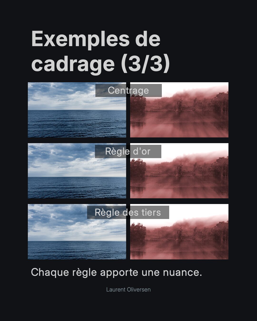 À vous d’adapter cette règle ou de la contourner volontairement suivant la situation. En effet, on pourra parfois centrer volontairement le sujet de l’image pour jouer sur des symétries ou évoquer une impression de solennité.