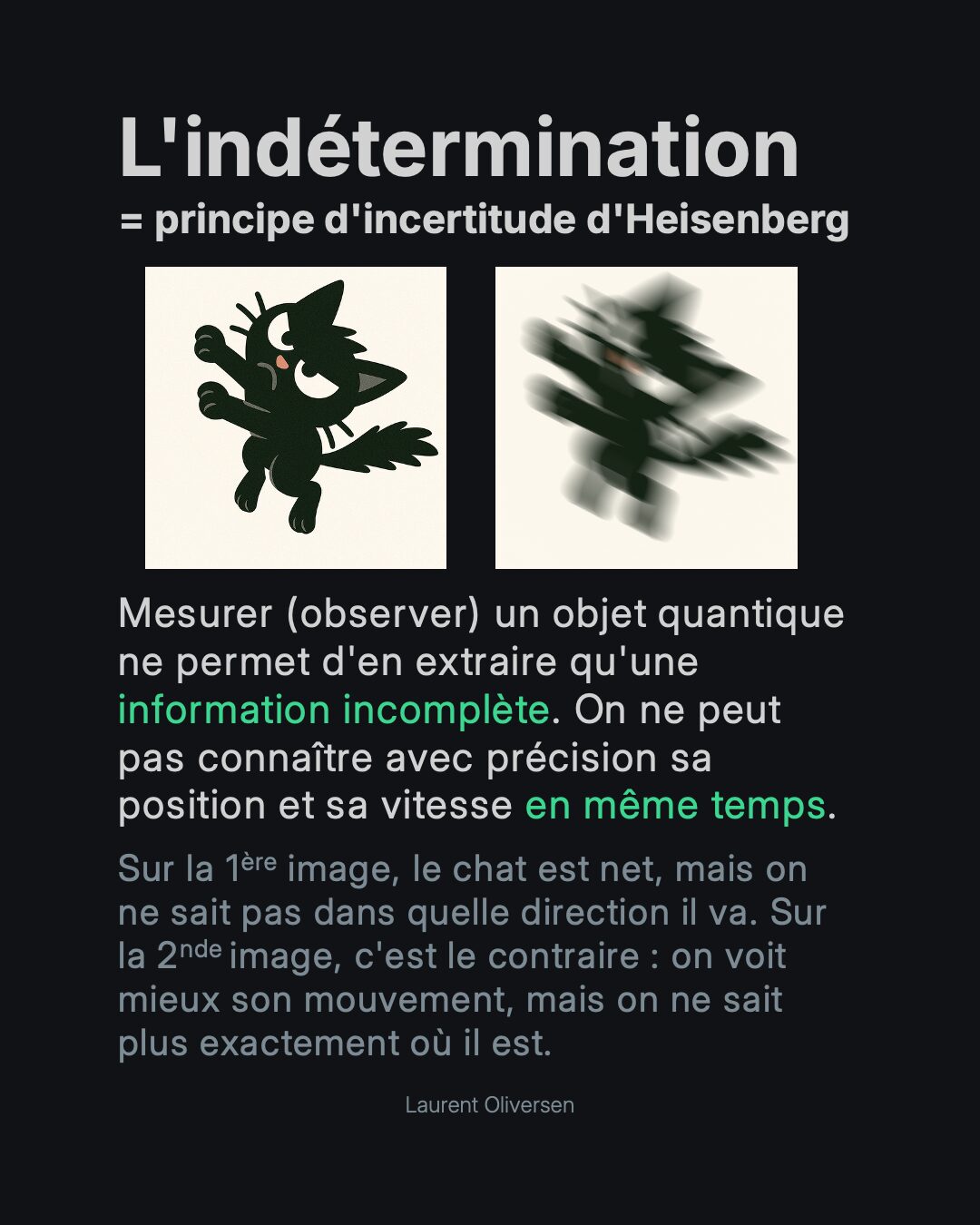 Supposons que vous attendez les résultats à un examen et que vous vous apprêtez à ouvrir le mail qui vous apportera la réponse. Votre esprit considère les deux états et vous les fait ressentir : vous percevez déjà les bribes de l’exultation (succès) et de la déception (échec), noyées dans un fugace courant d’angoisse et d’espoir. Tant que le “coup d’œil” n’est pas porté, tant que le message n’est pas lu, vos pensées demeurent en superposition d’un point de vue métaphorique. À l’image de cette pièce quantique encore en suspension dans votre paume, votre esprit semble vibrer entre deux faces émotionnelles en imaginant les deux univers possibles. Mais quand le mail s’ouvre et que le couperet tombe, tous vos sentiments convergent aussitôt vers celui lié à l’observation : allégresse ou peine. Voilà l’effondrement qui succède à l’indétermination.